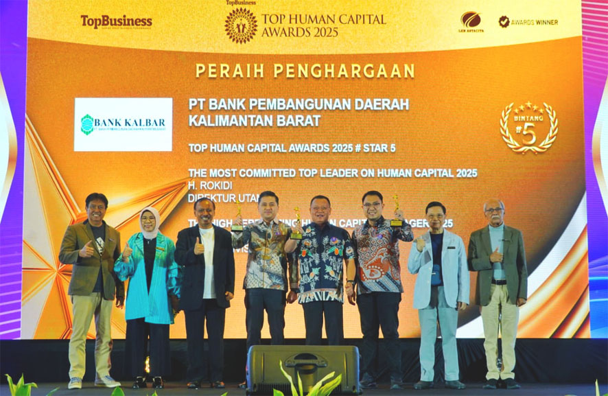 Bank Kalbar meraih tiga penghargaan sekaligus diantaranya ; TOP Human Capital Awards 2025 #5 Stars, H. Rokidi Direktur Utama Bank Kalbar terpilih sebagai The Most Commited TOP Leader on Human Capital 2025, dan Rizky Hadi Kepala Divisi Sumber Daya Manusia dinobatkan the high performing human capital manager 2025.