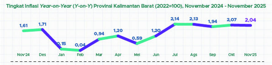 Badan Pusat Statistik (BPS) Provinsi Kalimantan Barat (Kalbar) merilis pergerakan inflasi daerah ini pada November 2025 yang berada di angka 2,04 persen secara tahunan (yoy), dengan Indeks Harga Konsumen (IHK) sebesar 108,50. Sementara inflasi bulanan (mtm) tercatat sebesar sebesar 0,24 persen dan inflasi tahun kalender (year to date/ytd) sebesar 1,57 persen.