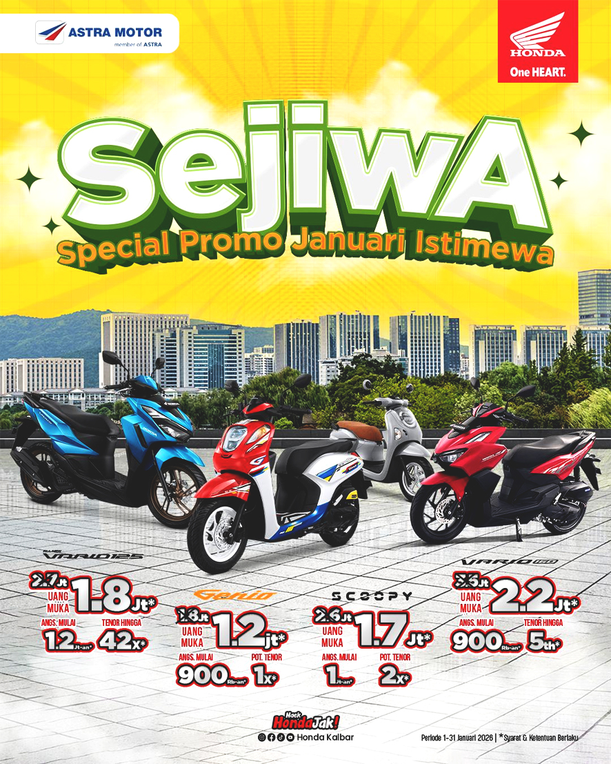 Astra Motor (Asmo) Kalbar sebagai main dealer motor Honda untuk wilayah Kalimantan Barat hadir memberikan promo pada setiap pembelian motor Honda secara kredit di seluruh dealer di area Kota Pontianak hingga 31 Januari 2025. Promo yang bertajuk “Sejiwa” yakni Spesial Promo Januari Istimewa memberikan pilihan sepeda motor yang bisa konsumen dapatkan di promo Sejiwa ini.