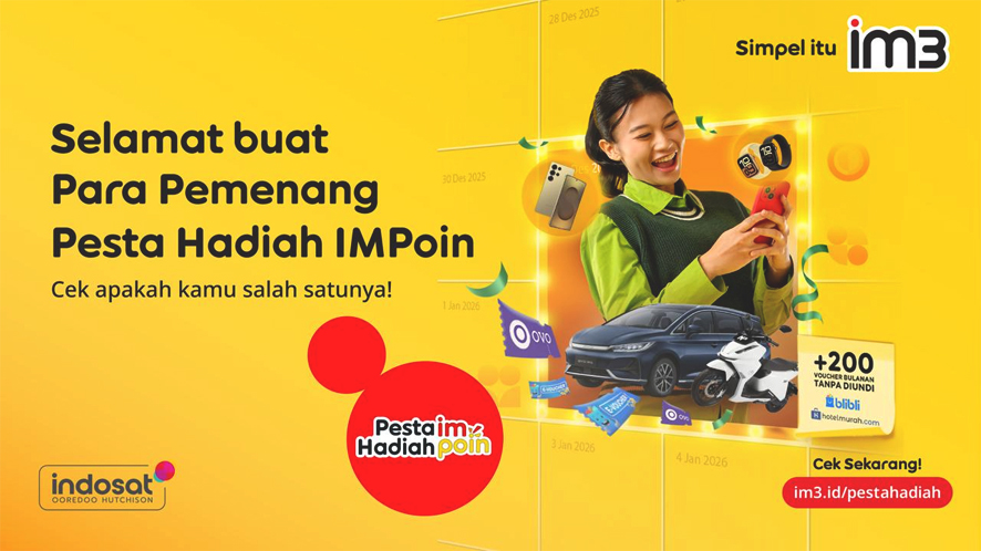 Indosat Ooredoo Hutchison (Indosat atau IOH) melalui brand IM3 secara resmi mengumumkan para pemenang Pesta Hadiah IMPoin 2025, program apresiasi tahunan yang menjadi bentuk terima kasih IM3 atas kepercayaan jutaan pelanggan, baik yang telah bersama IM3 sejak lama maupun mereka yang baru memulai perjalanan digitalnya bersama IM3 dan IM3 Platinum.