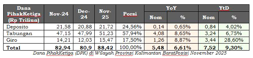 Dari sisi penghimpunan dana, Dana Pihak Ketiga (DPK) di Kalimantan Barat mencapai Rp88,4 triliun, yang didominasi oleh dana tabungan sebesar Rp 51,2 triliun, diikuti deposito sebesar Rp21,7 triliun, dan giro sebesar Rp15,5 triliun, dengan persentase pertumbuhan tertinggi dari giro yakni sebesar 6,61 persen (yoy).