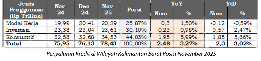 Penyaluran kredit perbankan di Provinsi Kalimantan Barat hingga November 2025 tercatat sebesar Rp 78,4 triliun, didominasi oleh kredit konsumtif, diikuti kredit investasi dan kredit modal kerja.