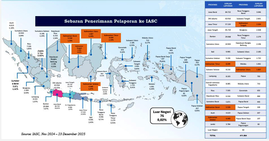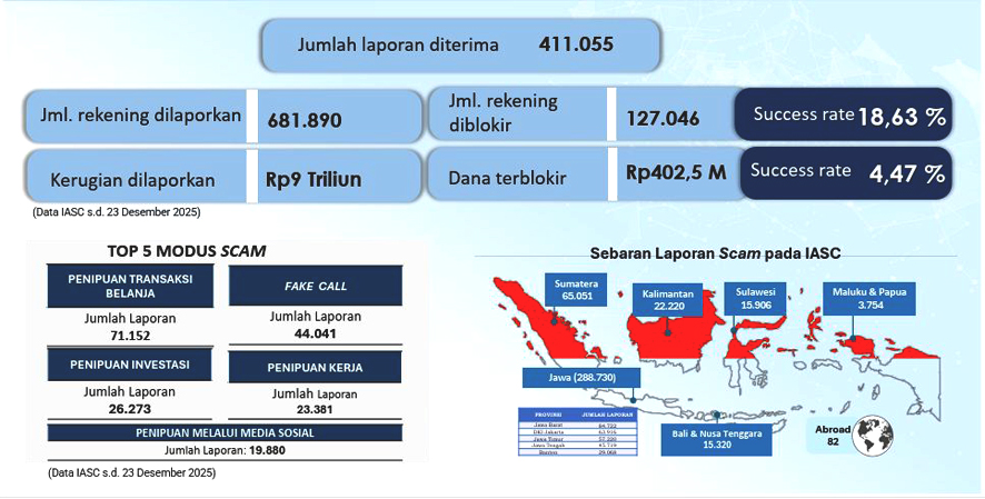 Parjiman mengungkapkan, hingga 23 Desember 2025, laporan yang diterima IASC sebanyak 411.055, dengan jumlah rekening 681.890 dan rekening yang diblokir 127.046 (18,63 persen). Adapun jumlah kerugian yang dilaporkan sebanyak Rp 9 triliun dan dana yang terblokir Rp 402,5 miliar. Masih sangat kecil dibandingkan nilai kerugiannya, yakni hanya 4,47 persen.