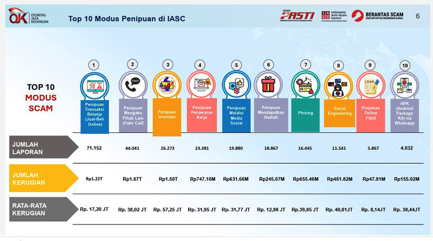 OJK juga mendata top 10 modus scam yakni: Pertama Penipuan transaksi belanja (jual beli online) dengan jumlah laporan 71.152 kasus dan jumlah kerugian mencapai Rp1,22 triliun (rerata kerugian capai Rp 17,20 juta.