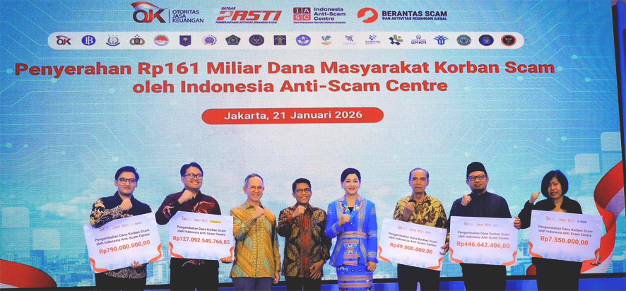 Indonesia Anti-Scam Centre (IASC) berhasil mengembalikan Rp161 miliar yang merupakan dana dari 1.070 masyarakat korban scam/penipuan digital yang berhasil diblokir IASC dari 14 bank yang digunakan pelaku kejahatan penipuan. Data merupakan catatan sejak IASC mulai beroperasi, 22 November 2024 hingga 12 Januari 2026.