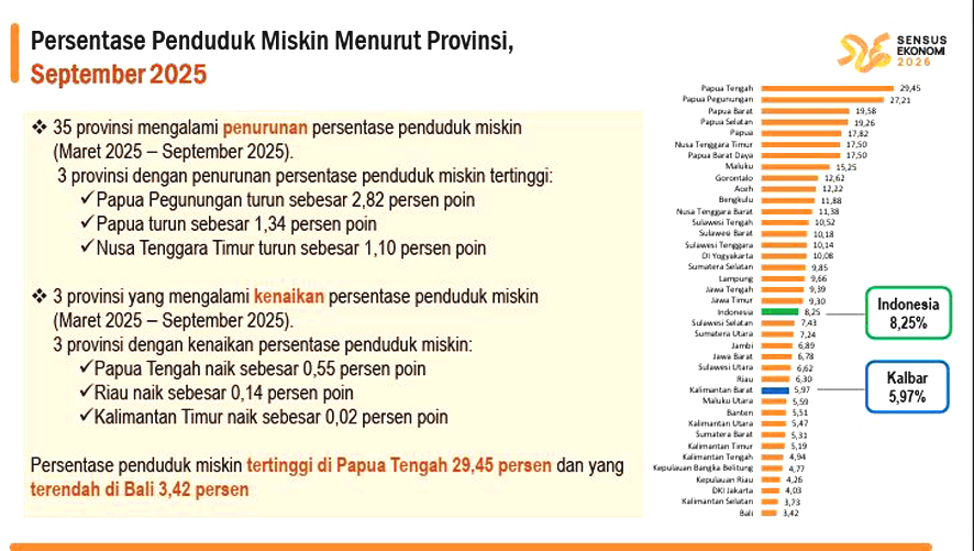 Dibandingkan Maret 2025, Indeks Kedalaman Kemiskinan (P1) dan Indeks Keparahan Kemiskinan (P2) dan September 2025 mengalami penurunan. Indeks Kedalaman Kemiskinan pada September 2025 sebesar 0,727, turun dibandingkan Maret 2025 yang sebesar 0,864. Sementara itu, Indeks Keparahan Kemiskinan pada September 2025 sebesar 0,154, turun dibandingkan Maret 2025 yang sebesar 0,177.