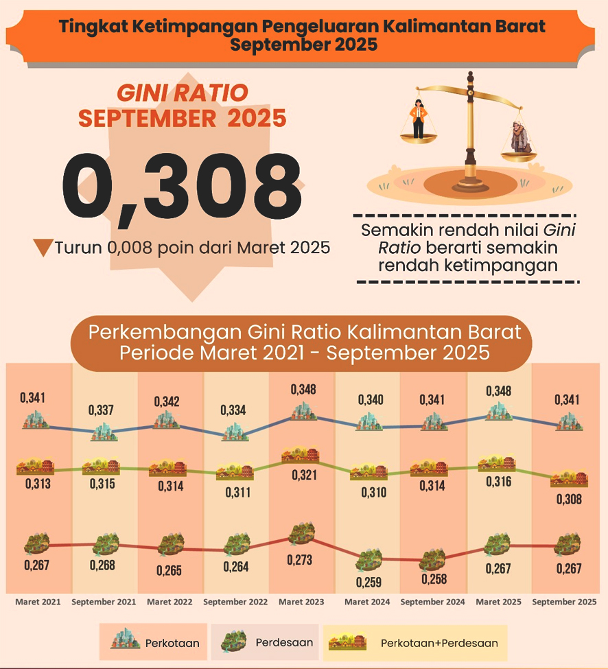 “Menurunnya tingkat ketimpangan pengeluaran penduduk mencerminkan distribusi pengeluaran yang kian merata di tengah dinamika pemulihan ekonomi. Perbaikan ketimpangan ini juga terjadi merata di daerah perkotaan dan perdesaan,”kata Kepala Badan Pusat Statistik (BPS) Kalbar, Muh Saichudin pada konferensi pers Berita Resmi Statistik (BRS) pada Kamis, 5 Februari 2026 di Pontianak.