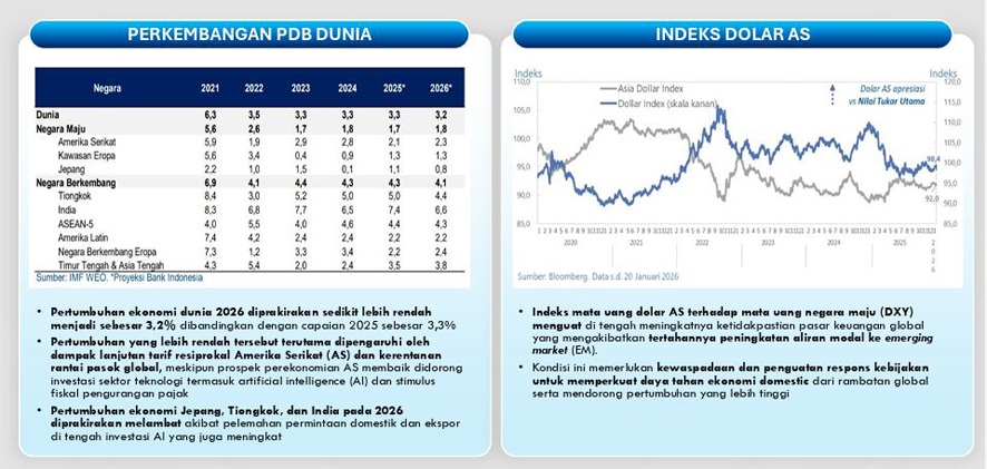 Doni memaparkan, pertumbuhan ekonomi dunia yang lebih rendah, terutama dipengaruhi oleh dampak lanjutan tarif resiprokal Amerika Serikat (AS) dan kerentanan rantai pasok global, meskipun prospek perekonomian AS membaik didorong investasi sektor teknologi, termasuk artificial intelligence (AI) dan stimulus fiskal pengurangan pajak.