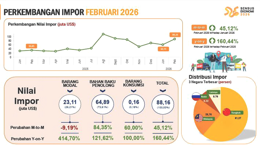 Sementara nilai impor Kalbar pada Februari juga terdata naik sebesar 45,12 persen jika dibandingkan pada Januari 2026, yaitu dari 60,75 juta dolar menjadi 88,16 juta dolar.