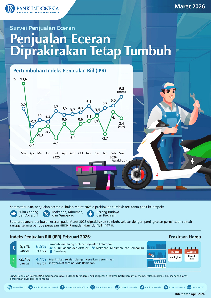 Bank Indonesia melaporkan, kinerja penjualan eceran pada Maret 2026 diprakirakan tetap tumbuh. Hal ini tecermin dari Indeks Penjualan Riil (IPR) Maret 2026 yang tumbuh sebesar 2,4 persen secara tahunan (yoy).