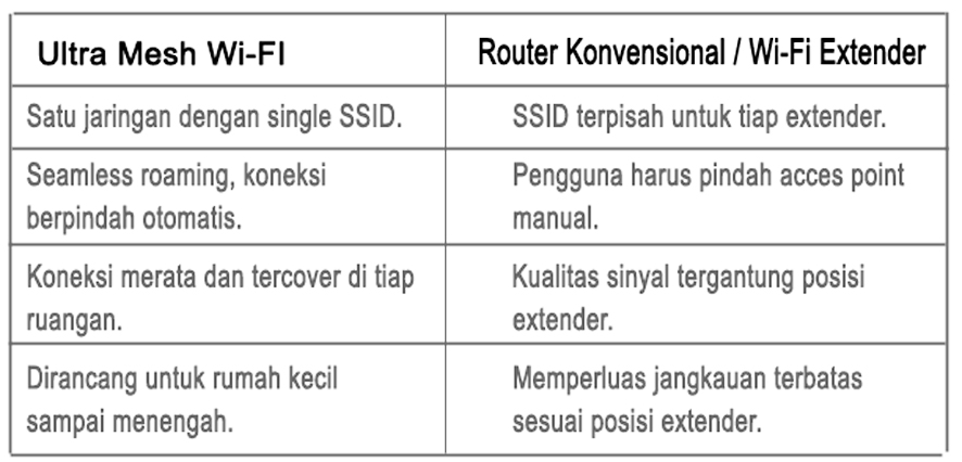Berbeda dari router konvensional atau Wi‑Fi extender yang mengharuskan pelanggan berpindah jaringan secara manual saat berganti ruangan, teknologi mesh bekerja dalam satu jaringan terintegrasi.